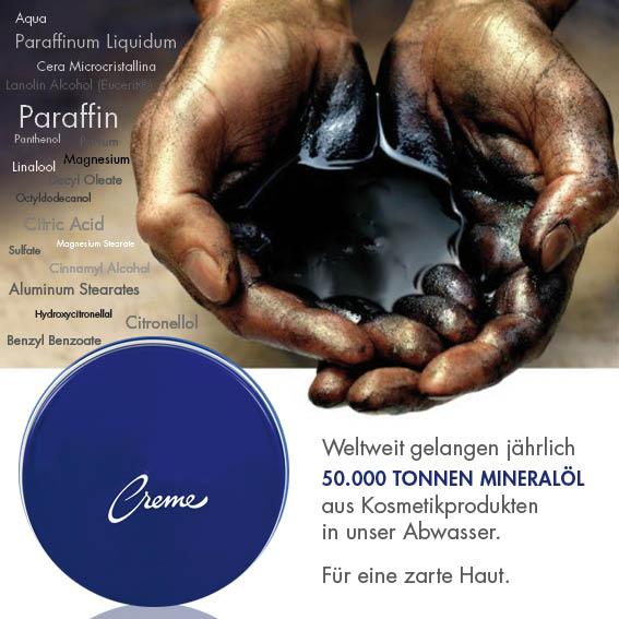 Weltweit gelangen jährlich 50.000 Tonnen Mineralöl aus Kosmetikprodukten in unser Abwasser. Für eine zarte Haut.