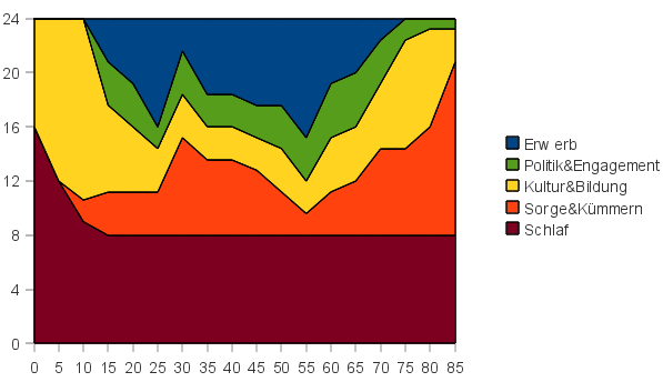 The scientist Frigga Haug proposed to distinguish four areas of human activity and for this to apply a similar amount of time: the acquisition, care, culture and politics. Only then will we have the chance to live a balanced life, to be independent and to gain experience in various fields. The acquisition is the work that we have to pay for our material life 1 . This includes wage employment or self-employment and serves not only the production of food, but also of things that make life pleasant. If the concern is about the recognition of the work for the household and children. These include cooking, cleaning, washing who care for working and playing with children, care for their own health, but also other people. Cultural activity expands our intellectual and emotional horizons and create individual development. These include education, understood as lifelong learning, active or passive artistic activity, but also time for yourself Furthermore, interference in politics is necessary to shape the society. This includes active participation in associations or participation in political committees. Frigga Haug, in her book "The Four-in-a-perspective" not all the areas described in every detail, but passes them forth from different perspectives. I would assign to the area and purchase all the services that we consume or generate. Frigga Haug originally used in the care of the technical concept of reproduction, which is aimed at the production capacity, thus strengthening the acquisition. I prefer to use the concept of care and mean subsistence, also includes work in a private garden or as the repair of equipment. For culture is also reading, studying, teaching and research, have fun together, maybe on a stage standing or dancing in ecstasy advised to take care of your body and your fitness or to reflect a try. In politics, I would not only work in committees, which include a club or in a cooperative, but the reports or uncovering and publishing, for example in an Internet blog.