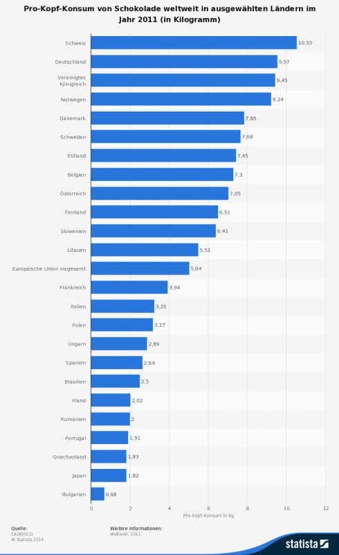 Schokohase, Schokoweihnachtsmann, Schokoherz ... egal zu welcher Jahreszeit, egal zu welchem Anlass, Schokolade ist der Inbegriff uneingeschränkten Genusses. Die Lust auf Schokolade ist weiterhin ungebrochen. Eine Statistik auf der Website www.statista.com zeigt den geschätzten Pro-Kopf-Konsum von Schokolade weltweit in ausgewählten Ländern im Jahr 2011. Die Schweiz ist mit 10,55 Kilo pro Kopf der Spitzenreiter. Österreich liegt mit geschätzten 7,05 Kilo pro Kopf auf dem 9. Platz. Klar, ist dass bei einem billigen Preis, der Verbrauch steigt. Aber weiß ich überhaupt, wo und vor allem wie mein Lieblingsdessert hergestellt wird?