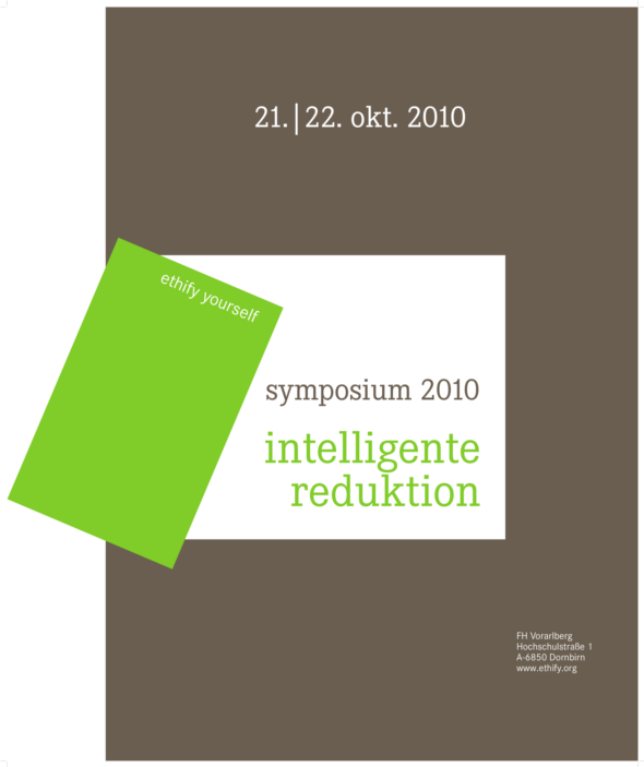 Entwürfe für die Kommunikation von Veranstaltungen rund um das Thema Ethik und Reduktion. Einige entstanden im zweiten Semester des Bachelor Studiengangs InterMedia an der FH Vorarlberg. Eine weitere Plakatserie gibt's hier von Karin Leggeri.
