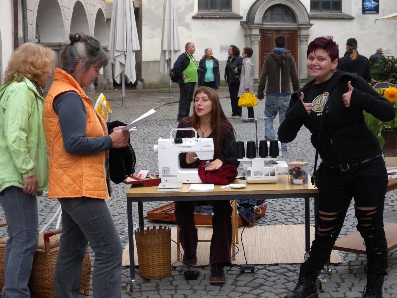 Sie plaziert sich und ihre Nähmaschine an öffentliche Orte um kaputte Kleidungsstücke zu reparieren.