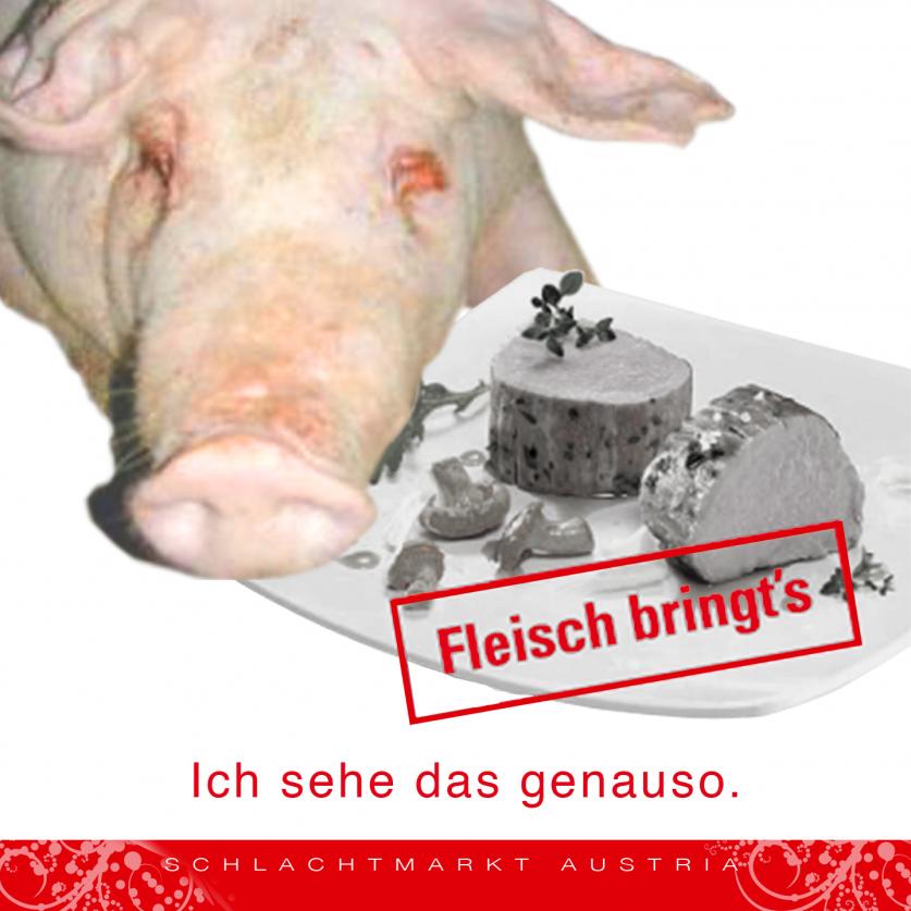 AdBuster der Fleischkampagne "Fleisch bringt's" der Agrarmarkt Marketing Austria GmbH. Ein Beispielbild, auf das der AdBuster anlehnt, ist unter http://www.epamedia.at/websites/web_9_5/pics/cl_pit08_ama.jpg zu finden. Das verwendete Bild des Schweines fanden wir unter http://respektiere.at/galerie.htm